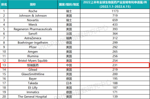 近日,全球专利数据库incoPat创新指数研究中心发布全球生物医药发明专利TOP100榜单,918搏天堂以上半年231件发明专利申请量位列榜单第13名,是唯一一家进入TOP20的中国药企。