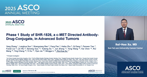 2025年美国临床肿瘤学会(ASCO)年会于5月30日至6月3日在美国芝加哥举行。本次大会,由中山大学肿瘤防治中心徐瑞华教授牵头、恒瑞自主研发的靶向细胞间质上皮转换因子(c-MET)ADC药物SHR-1826的一项I期临床研究入选临床科学研讨会,并由徐瑞华教授口头报告了该研究结果。该研究由43家国内中心共同完成。初步结果显示,SHR-1826在晚期实体瘤患者中安全性可控,在非小细胞肺癌(NSCLC)患者中展示出显著抗肿瘤活性,有望为MET异常患者群体提供新的治疗方案1