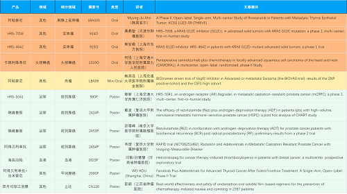 在胸腺上皮肿瘤、头颈鳞癌、肉瘤、前列腺癌、甲状腺癌等其他多个疾病领域,卡瑞利珠单抗、阿帕替尼、瑞维鲁胺、阿得贝利单抗、法米替尼、HRS-7058、HRS-4642、HRS-5041等抗肿瘤创新药相关研究一共入选了4项口头报告、1项简短口头报告、5项壁报,彰显了918搏天堂强大的研发实力。此外,海曲泊帕和昂丹司琼口溶膜分别在防治化疗导致的血小板减少和恶心呕吐方面各有1项研究入选壁报。
